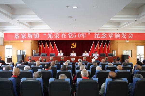 6月18日,蔡家坡镇举行“光荣在党50年”纪念章颁发会,为蔡家坡地区老党员颁发纪念章。经开区党工委副书记、管委会主任、蔡家坡镇党委书记王海刚,纪工委书记索文强,镇长杨龙飞出席颁发会。